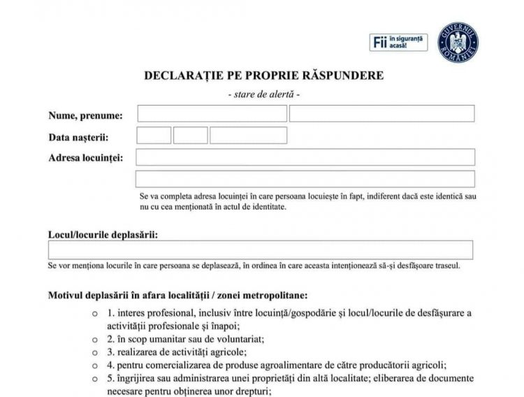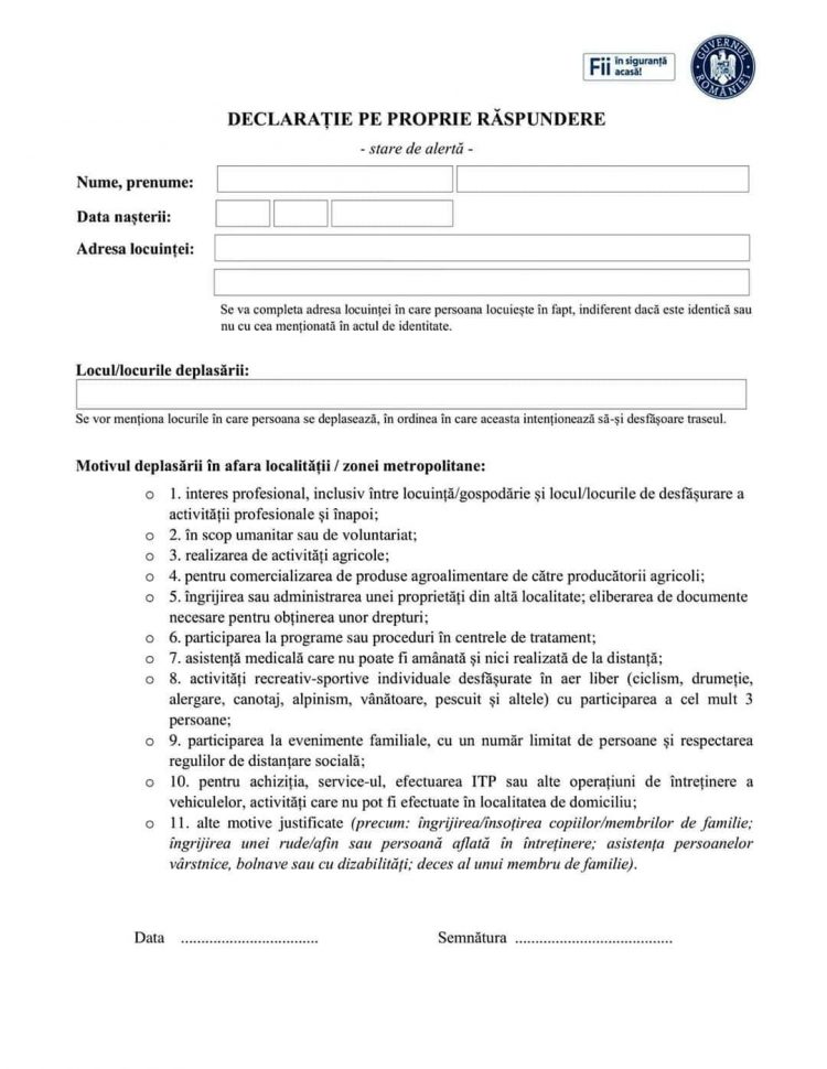 Noua declarație pe propria răspundere valabilă pe perioada stării de alertă. Documentul se folosește în cazul în care părăsiți localitatea, începând de astăzi