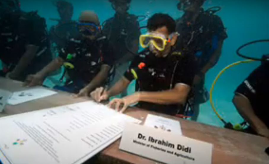2009: Spre a atrage atenția asupra problemelor țării sale pricinuite de creșterea nivelului mării ca urmare a încălzirii globale, președintele Maldivelor, Mohamed Nasheed, a organizat o ședință de cabinet taman pe fundul mării. Asta da idee creață. Oare peștii ce s-or fi gândit văzând una ca asta?