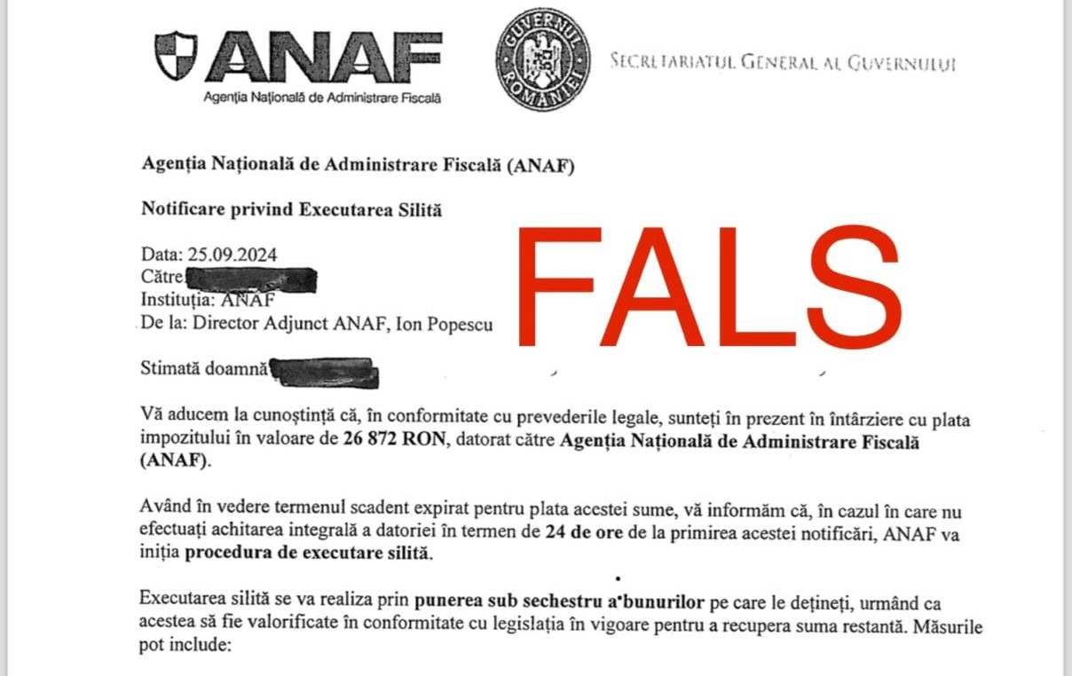 ”Mesajele sunt transmise, de această dată, de la adresa de e-mail [email protected]. Atragem atenția că această adresă de e-mail NU aparține ANAF și nu trebuie să dați curs solicitărilor! Reamintim contribuabililor că ANAF nu informează contribuabilii despre creanțe prin e-mail; informațiile privind situația fiscală proprie, somațiile, alte înștiințări sunt comunicate securizat fie prin SPV, fie prin Poșta Română, cu confirmare de primire”, mai arată ANAF.