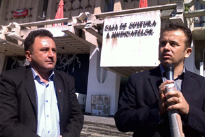 Tricouri (cu un mesaj inteligent, zic eu), baloane rosii cu sigla partidului si o ambianta sonora anti-Boc au definit atmosfera de sambata dimineata creata in fata Casei de Cultura. A sindicatelor, totusi. Dar care sindicalisti? Din cei 1.000 anuntati de Florin Hossu, liderul Cartel Alfa, nu am remarcat decat… doi. Cu un singur nume: Liviu Pop. Unul lider al sindicatului profesorilor, celalalt al functionarilor din administratie.