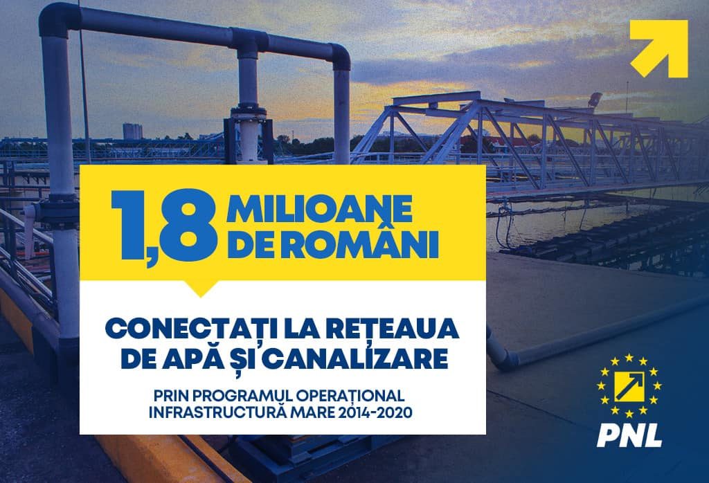 Prin Programul Operațional Infrastructură Mare (POIM) 2014-2020, românii beneficiază de o mai bună alimentare cu apă, ținta ce urmează să fie atinsă la finalul acestui an fiind de 1,8 milioane de persoane sprijinite.