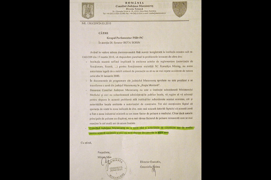 Mircea Man, presedintele tuturor, trebuie sa se decida daca a semnat declaratii in fals in necunostinta de cauza sau a mintit cu buna stiinta. Intr-un raspuns trimis senatorului PSD Sorin Bota, Mircea Man precizeaza ca in ceea ce priveste SC Romaltyn Mining, „Consiliul Judetean Maramures nu a emis nicio autorizatie de construire sau de mediu pentru aceasta societate si nici nu sunt depuse documente in acest sens”.
