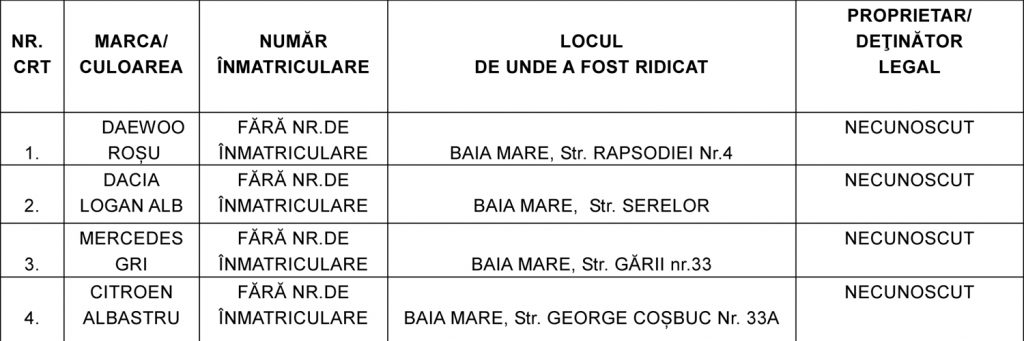 „Municipiul Baia Mare aduce la cunostinta opiniei publice tabelul nominal cuprinzand caracteristicile tehnice ale vehiculelor declarate fara stapan, ridicate de pe domeniul public al Municipiului Baia Mare care au fost trecute de drept in proprietatea Municipiului Baia Mare conform Legii nr. 421/2002, cu modificarile si completarile ulterioare, privind regimul juridic al vehiculelor fara stapan sau abandonate pe terenuri apartinand domeniului public sau privat al statului ori al unitatilor administrativ-teritoriale.