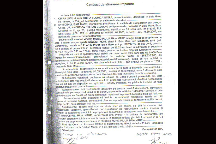 Liviu Chira, cel care a vandul Primariei Baia Mare blocul Horea 46 A, nu a fost la prima afacere imobiliara derulata cu municipalitatea. Relatiile comerciale dintre acesta si Primarie sunt mai vechi decat povestea blocului care i-a atras lui Cristian Anghel o condamnare de 2 ani si 6 luni inchisoare. In urma cu sapte ani, Primaria a cumparat doua apartamente proprietatea lui Liviu Chira, situate intr-un imobil de pe strada Minerilor din Baia Mare.