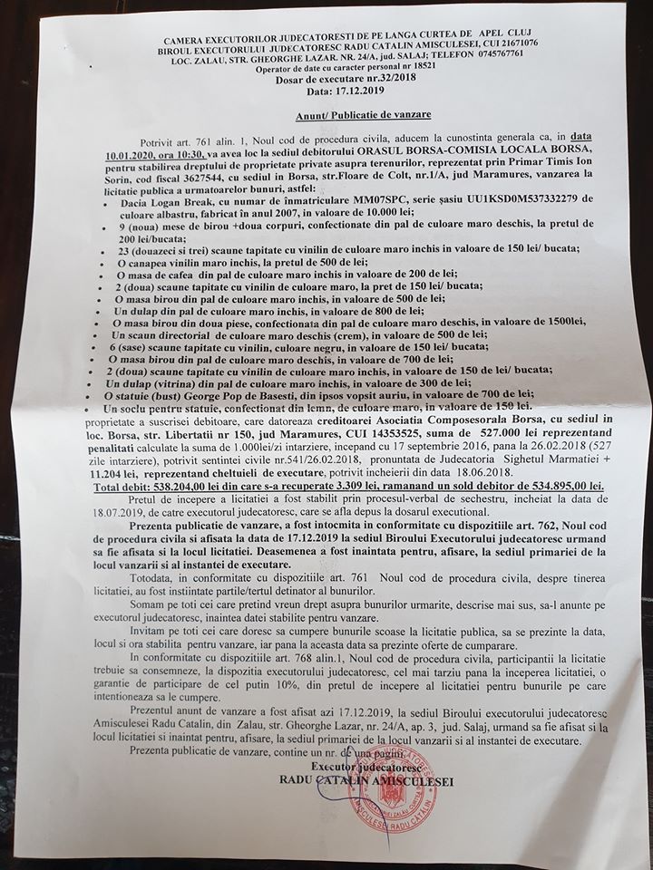 Primaria Borsa a ramas vineri, 10 ianuarie, fara mai multe bunuri din sediul institutiei, in urma unei executari silite in cazul celor 17.000 de hectare de teren revendicate si castigate in instanta de Asociatia Composesorala Borsa.