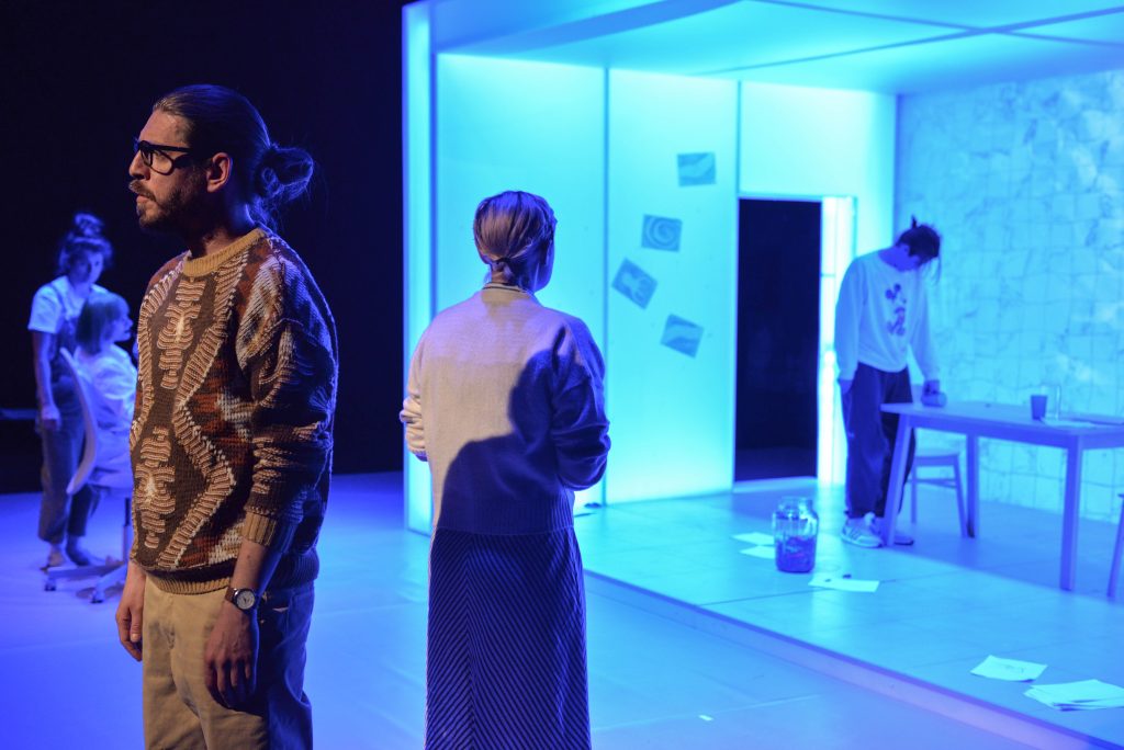 DELFINI prezintă drama unei familii cu un copil autist, situație care atrage după sine un întreg eșafodaj al luptei pentru a fi înțeles de către cei din jur. Spectacolul are o stranietate acvatică, deschizând o ușă tainică prin care pătrundem în lumea singulară a persoanelor neurodivergente, pentru care viața e dincolo de percepțiile obișnuite.