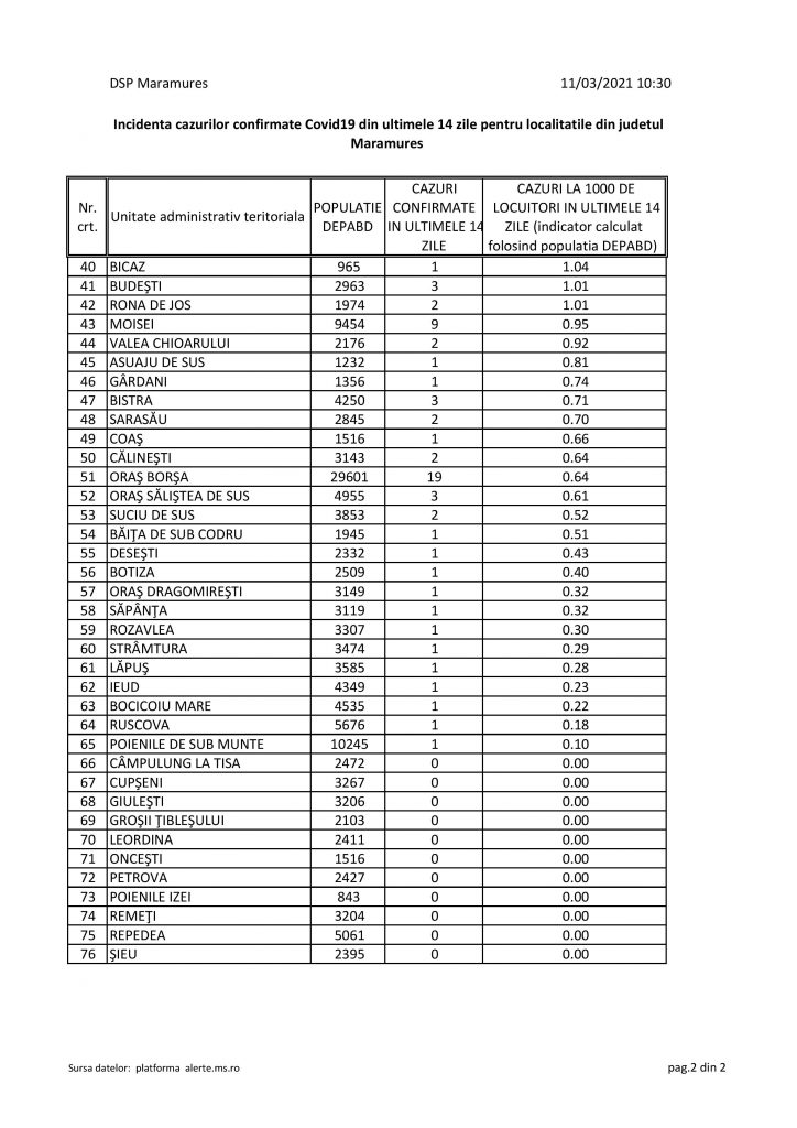 La nivel de Maramureș, incidența e 2.33. Detalii în lista de mai jos: