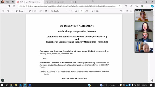 Acordul de Cooperare a fost semnat de cei doi președinți după luni de schimburi de informații prin corespondență e-mail și videoconferințe ZOOM, în cadrul cărora Florentin-Nicolae Tuș și Anthony Russo au stabilit punctual detaliile acestei colaborări. Tot urmare a discuțiilor celor doi președinți, au fost agreate întâlniri bilaterale între board-urile organizațiilor. Cele două instituții urmează să stabilească un plan de acțiuni comune care va include cel mai probabil în primăvara anului următor și o vizită a unei delegații a Asociației de Comerț și Industrie din New Jersey în România și implicit în județul Maramureș. De asemenea, prioritar va fi și schimbul de informații de interes pentru mediul de afaceri.
