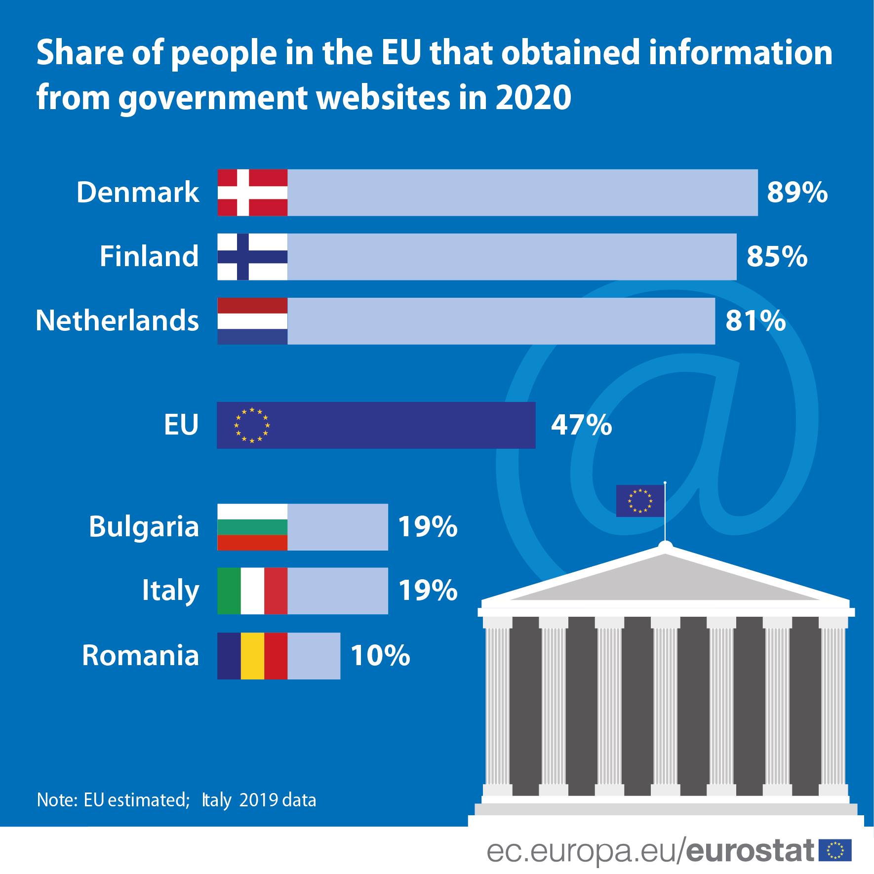 În 2020, 47% dintre persoanele din UE în vârstă cuprinsă între 16 și 74 de ani au obținut informații de pe site-urile autorităților publice, în ultimele 12 luni anterioare sondajului. Această pondere a crescut substanțial în comparație cu 2008, când era de 33%, precizează Eurostat.