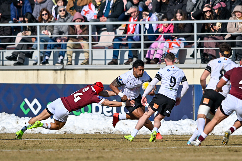 Georgia a început meciul cu o presiune mare și, după câteva minute de atac în zona de 22 a României, a reușit să deschidă scorul. După o fază rapidă pe linia de treisferturi, Alexander Todua a înscris primul eseu, 5-0, în minutul 6. Stejarii au avut o reacție și au ajuns în 22-ul georgian, punând presiune, dar nu au găsit soluțiile necesare pentru a depăși apărarea adversă.