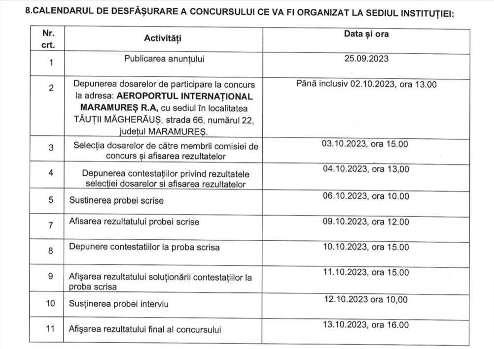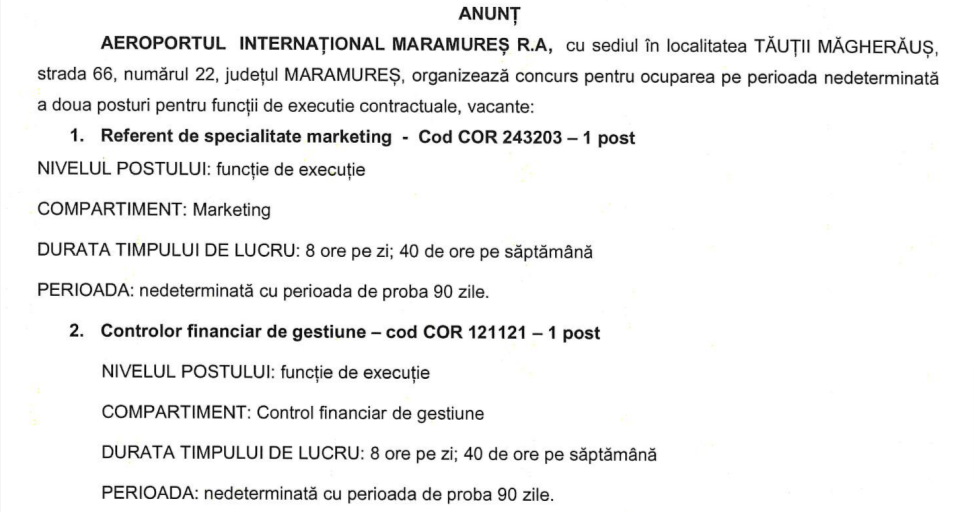 Aeroportul Internațional Maramureș organizează concurs pentru ocuparea pe perioadă nedeterminată a două posturi pentru funcții de execuție contractuale, vacante: