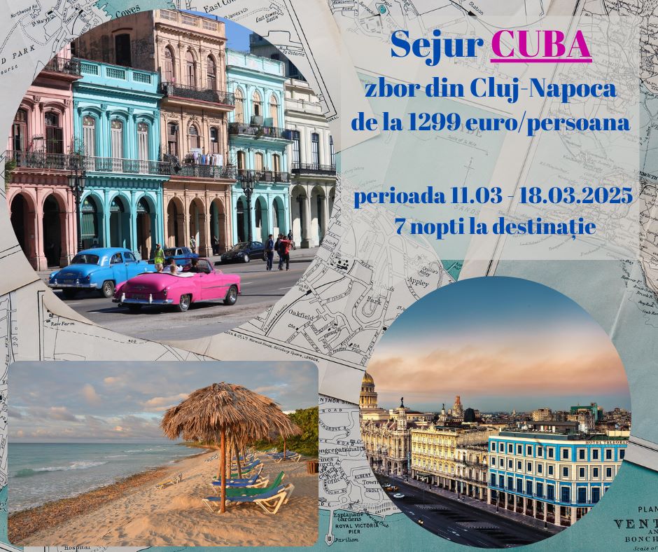 Perioada: 11-18 martie. Oferta include 7 nopți de cazare în cameră double room, mic dejun în Havana + all inclusive în Varadero, bilet de avion cu plecare din Cluj, taxe de aeroport, transferuri. Tarif: 1599 euro/ persoană/ sejur.