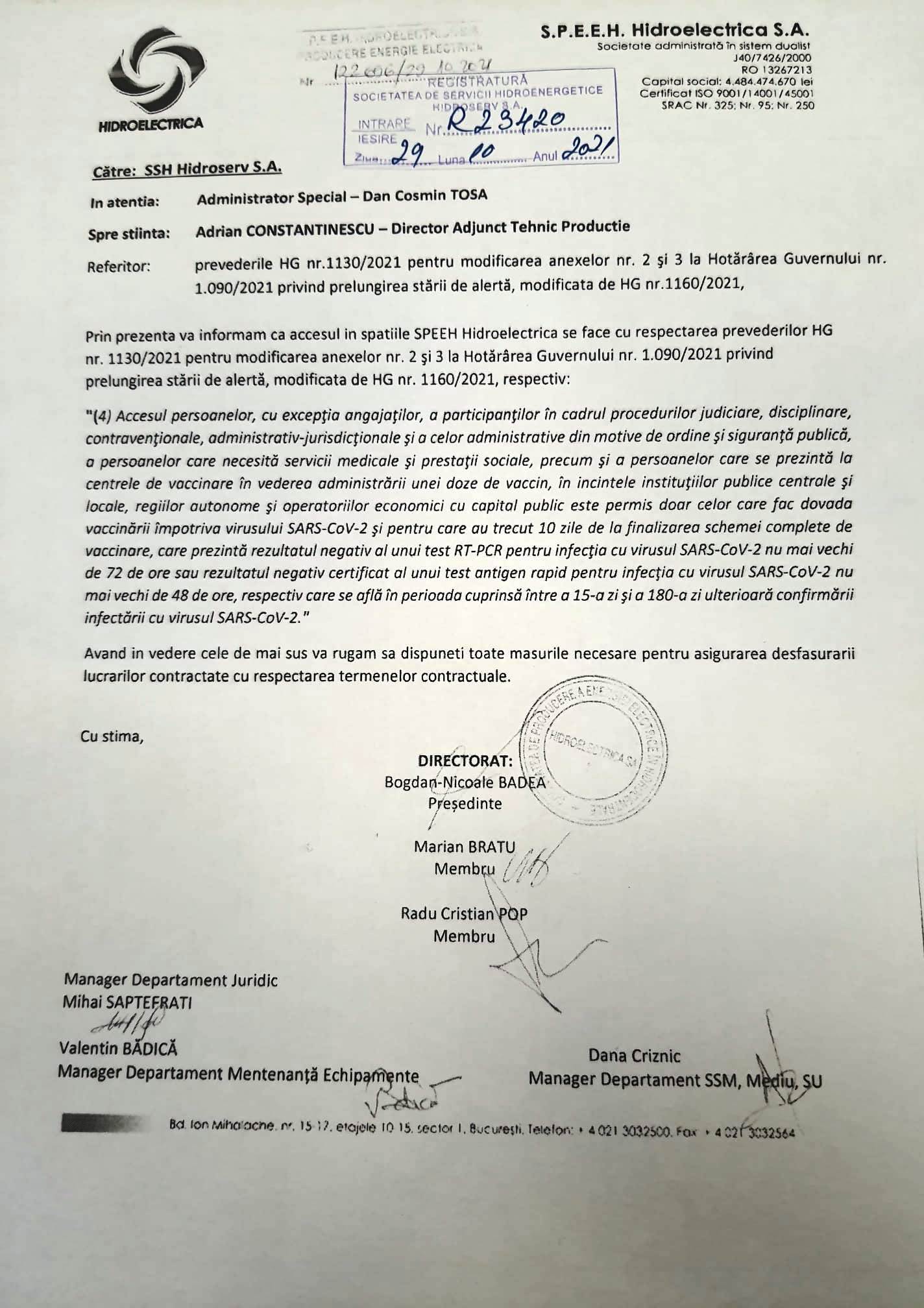Confederaţia Naţională Sindicală Cartel ALFA trage un semnal de alarmă cu privire la ceea ce se întramplă la Hidroelectrica, unde se interzice accesul personalului care asigura mentenanța instalațiilor dacă nu sunt vaccinați împotriva coronavirus. Sindicaliștii spun că „regulile adoptate prin prelungirea stării de alertă, prin care accesul persoanelor în instituţiile publice, altele decât angajaţii, este condiţionat de prezentarea certificatului verde (HG 1130/2021) au creat în practică situaţii stranii, discriminatorii şi greu de pus în aplicare”.