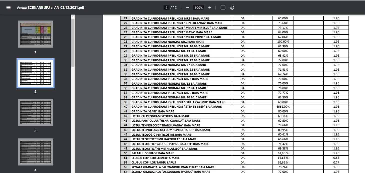 Inspectoratul Școlar Județean (ISJ) Maramureș a dat publicității, în acest final de săptămână, scenariile funcționării unităților de învățământ din județ pentru săptămâna care urmează. Toate unitățile de învățământ din județ se vor afla în scenariul verde, adică elevii vor fi prezenți fizic în bănci. În total sunt 400 de unități școlare (structuri cu personalitate juridică și unitățile arondate) unde școala se va face ca dinainte de pandemie. Dacă ne uităm la procentul de vaccinare a personalului din școli, observăm că avem în județ, în Baia Mare mai exact, o grădiniță unde procentul de vaccinare este de…6562,00%. Este vorba despre Grădinița cu Program Prelungit „Step by Step” Baia Mare, singura din județ cu acest procent de vaccinare impresionant.