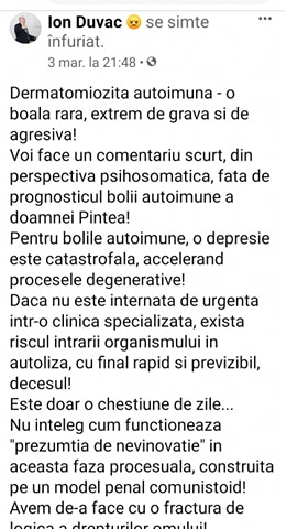 [22:41, 3/4/2020] xxx: Si sa ceara avocatii in scris parerea medicala, profesionala, a Societatii romane de boli rare, Dermatomiozita ca si boala autoimuna , tratament imunosupresor, recadere, sa ceara medicii cu competenta in aceasta societate internarea si conduita de tratament, daca medicul curant sta acasa in carantina