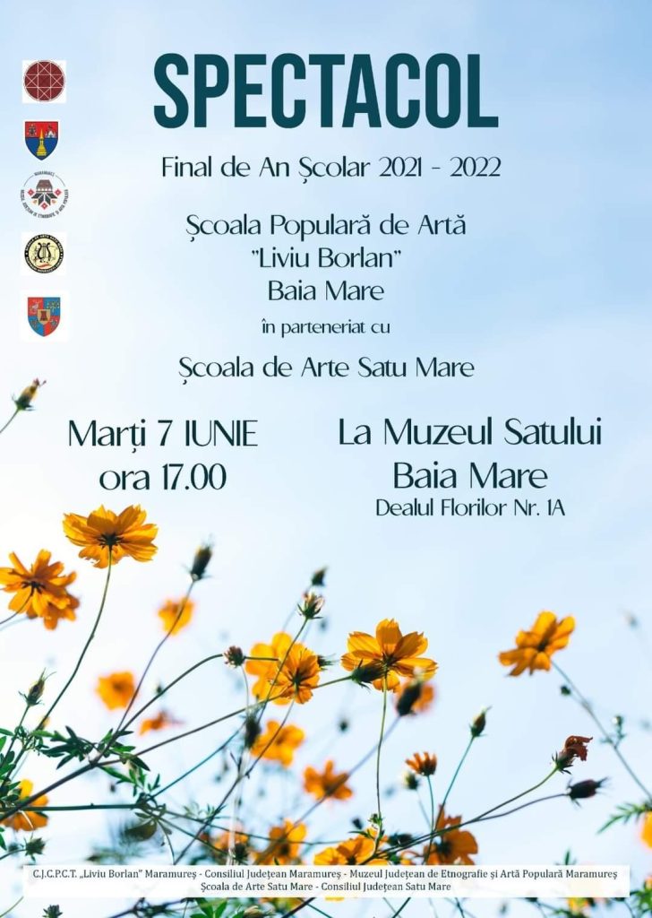 Consiliul Județean Maramureș, prin Centrul Județean pentru Conservarea și Promovarea Culturii Tradiționale ”Liviu Borlan” Maramureș, Muzeul Județean de Etnografie și Artă Populară Maramureș, în parteneriat cu Școala Populară de Arte Satu Mare, vă invită la spectacolul organizat pentru a marca finalul de an școlar 2021 – 2022.