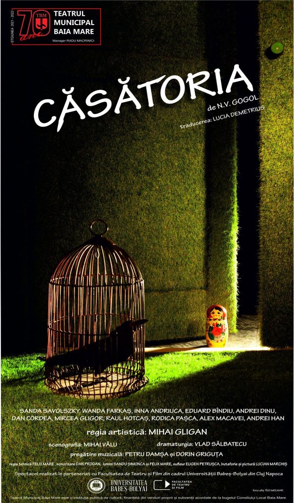 Săptămâna aceasta, Secția Dramă a Teatrului Municipal Baia Mare va prezenta în premieră, spectacolul ”Căsătoria”, după N.V. Gogol, în regia lui Mihai Gligan. Scenografia este semnată de Mihai Vălu, iar din distribuție fac parte actorii Sanda Savolszky, Wanda Farkaș, Inna Andriuca, Eduard Bîndiu, Andrei Dinu, Dan Cordea, Mircea Gligor, Raul Hotcaș, Rodica Pașca, Alex Macavei și Andrei Han.