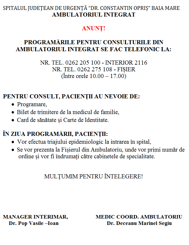 Spitalul Judetean de Urgenta “Dr. Constantin Opris” din Baia Mare aduce la cunostinta publicului faptul ca, programarile pentru consulturile efectuate in Ambulatoriul Integrat se fac telefonic la numerele 0262 205 100 (interior 2116) si 0262 275 108 (fisier), de luni pana vineri, intre orele 10.00 – 17.00.