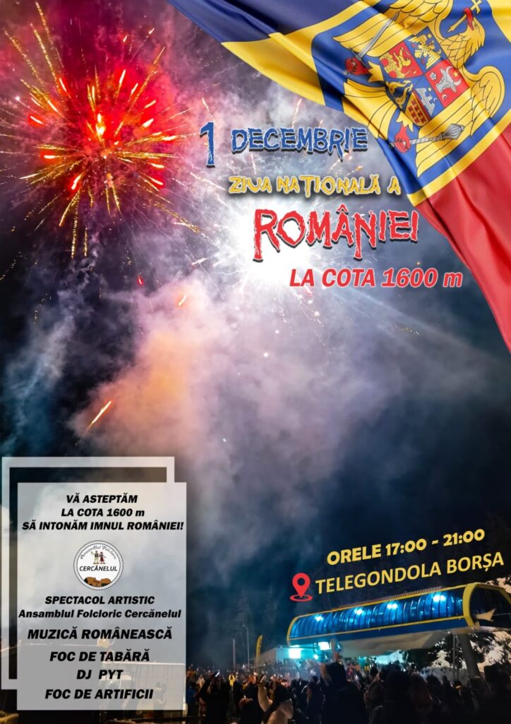 Localnicii și turiștii care aleg să petreacă minivacanța de 1 Decembrie în Stațiunea Turistică Borșa sunt așteptați începând cu orele 17:00 la stația finală a telegondolei într-o atmosferă autentic românească prin programul folcloric susținut de Ansamblul Cercănelul din Borșa, foc de tabară și spectacol pirotehnic.
