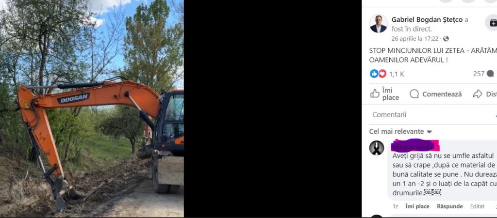 Nu negăm că se lucrează acolo, pare chiar o lucrare (doar) demarată serios, însă cu o floare nu se face primăvară. Însuși Ștețco, în clipul video, de tip reportaj abuziv (!), recunoaște că reabilitarea acestui drum reprezintă cam a opta parte din toată lucrarea, iar mandatul său și al lui Ionel Bogdan sunt la final. Deci, la sfârșitul mandatului, Șteșco și Bogdan se laudă că au început reabilitarea la un tronson de drum. Așadar, nu finalizare: după patru ani, acești oameni ne comunică faptul că s-ar apuca de treabă, dacă le mai dăm votul o dată.