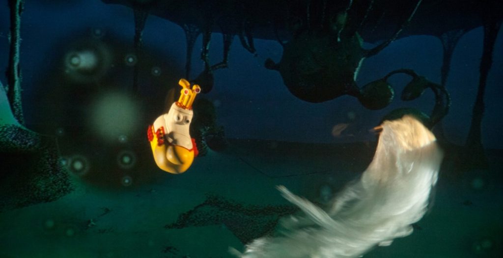 „Submarinul galben” este realizat de echipa formată din Radu Dinulescu (regizor de teatru) şi de artistul belgian Armand Richelet-Kleinberg (grafist, muzician și producător de film), prima din lume care a creat un spectacol stereoscopic cu imagini 3D. Imaginile se derulează pe un ecran transparent de tip tull în spatele căruia, într-o lumină specială, evoluează actori care mânuiesc marionete, păpuși, obiecte. Din distribuție fac parte Carmen Bulancea, Iulian Bulancea, Camelia Blidar Strat.