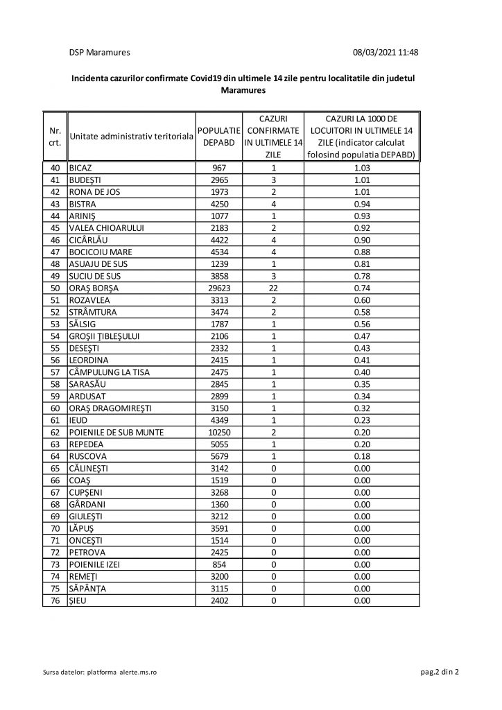 Astfel, luni, 8 martie, se constată că 12 localități din județ sunt cu 0 pe linie (atât la număr de cazuri, cât și la rata de infectare): Călinești, Coaș, Cupșeni, Gârdani, Giulești, Lăpuș, Oncești, Petrova, Poienile Izei, Remeți, Săpânța, Șieu.