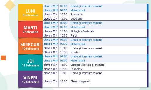 15.00-16.00 – ore de limba și literatura română, matematică, biologie, fizică, istorie, geografie, chimie, informatică, economie, filosofie, logică, sociologie – clasa a XII-a