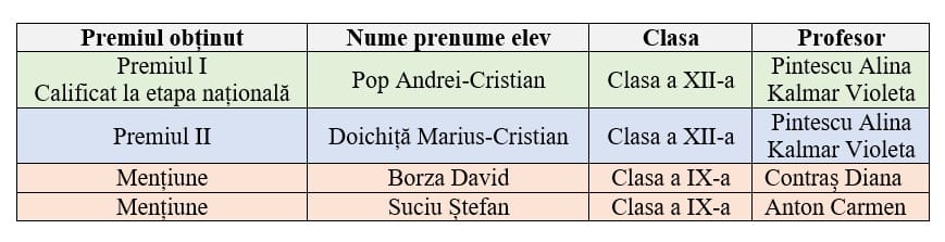 Felicităm pe această cale elevii premiați și îi dorim mult succes și inspirație lui Andrei-Cristian Pop, singurul elev din județ calificat la Etapa națională”, spun reprezentanții Colegiului Național ”Gheorghe Șincai”.