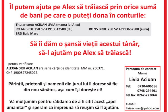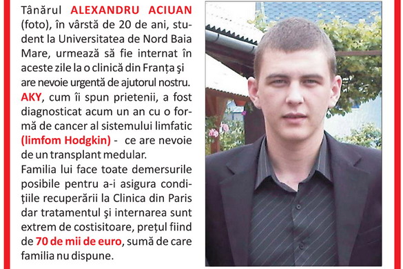 Un tanar student al Universitatii de Nord Baia Mare are o singura sansa de a trai. Boala sa (cancer limfatic) necesita un transplant medular. Costurile acestei interventii medicale costa 70 de mii euro. Pentru a ajuta familia tanarului Alex, Serviciul Public Asistenta Sociala Baia Mare s-a implicat intr-o campanie de strangere de fonduri, in vederea acoperirii sumei de bani necesare tratamentului si recuperarii lui Alex intr-o clinica din Paris.