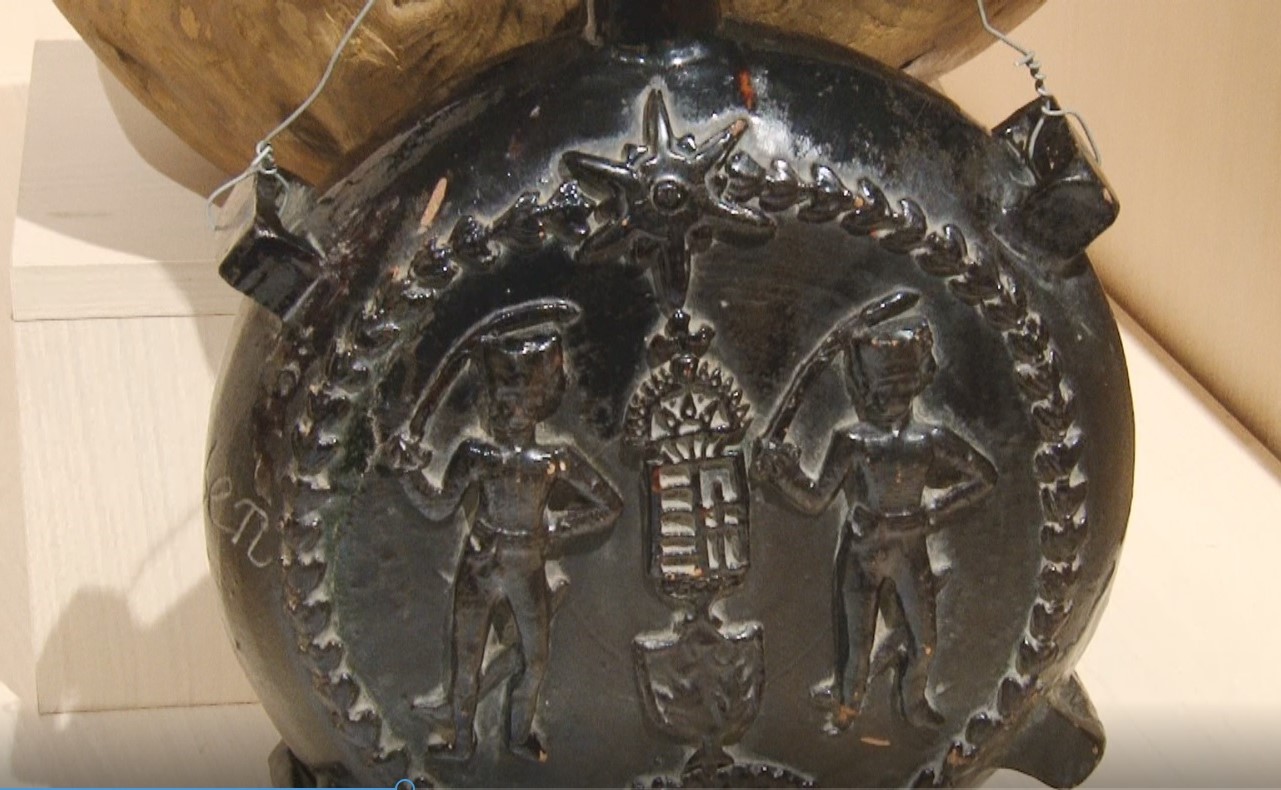 „Unul din vasele emblematice al colecției noastre este o ploscă datată la 1850, realizată la cererea unei asociații profesionale miniere. Vasul este de culoare brun închis, este decorat pe ambele fețe, ornamentele au fost realizate prin sculptarea lor pe o fâșie de lut moale și aplicate mai apoi pe corpul vasului. În partea inferioară se află un coș al abundenței, deasupra căruia sunt înșiruite trei pocale din care se ridică doi șerpi încolăciți, considerați a fi protectori ai averii. Deasupra pocalului central observăm un semn heraldic care amintește de stema Austriei. Minele din Transilvania au fost proprietatea Coroanei Imperiale. E un obiect prețios, fiind selectat să facă parte din tezaurul național”, ne spune Teremtuș Oana, muzeograf la Muzeul de Etnografie și Artă Populară Baia Mare.