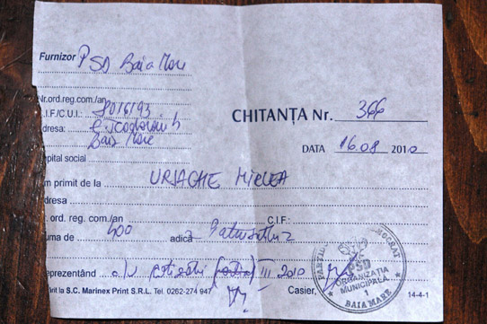 Cel putin in cazul lui Mircea Ursache, lucrurile sunt ceva mai sensibile in ceea ce priveste cotizatiile. Asa cum arata si chitantele prezentate in fotografiile atasate materialului, presedintele Mircea Ursache si-a platit cotizatiile catre PSD pana in luna septembrie a acestui an. Contributia sa la partid a fost de 400 lei lunar.