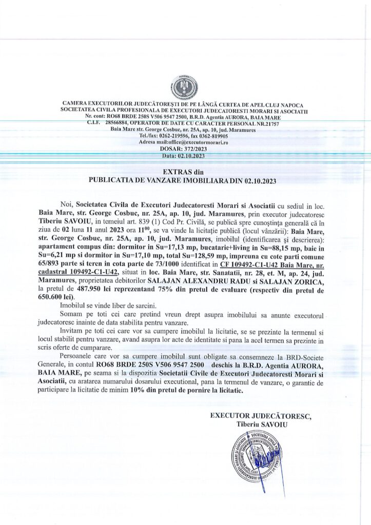 Vânzare apartament în Baia Mare – Extras publicație imobiliară, din data de 02. 10. 2023
