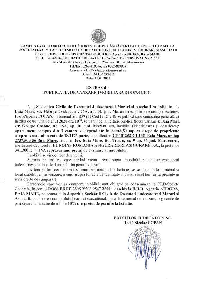 Noi, Societatea Civila Profesionala de Executori Judecatoresti Morari si Asociatii cu sediul in loc. Baia Mare, str. George Cosbuc, nr. 25A, ap. 10, jud. Maramures, prin executor judecatoresc Iosif-Nicolae POPAN, in temeiul art. 839 (1) Cod. Pr. Civila, se publica spre cunostinta generala ca in ziua de 06 luna 05 anul 2020 ora 10.00, se va vinde la licitatie publica (locul vanzarii): Baia Mare, str. George Cosbuc, nr. 25A, ap. 10, jud Maramures din imobilul descris in documentul de mai jos:
