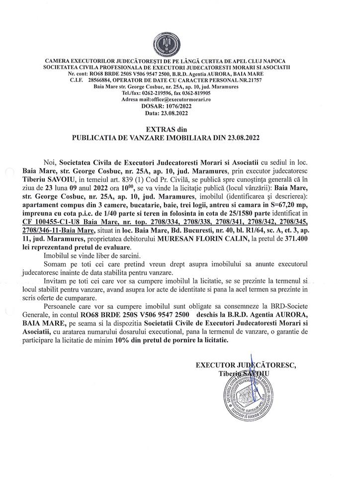 Noi, Societatea Civilă Profesională de Executori Judecătorești Morari și Asociații cu sediul în loc. Baia Mare, str. George Coșbuc, nr. 25A, ap. 10, jud. Maramureș, prin executor judecătoresc Tiberiu SĂVOIU, în temeiul art. 839 (1) Cod. Pr. Civilă, se publică spre cunoștința generală că în ziua de 23 luna 09 anul 2022 ora 10.00, se va vinde la licitație publică (locul vânzării): Baia Mare, str. George Coșbuc, nr. 25A, ap. 10, jud Maramureș, imobilul descris în documentul de mai jos: