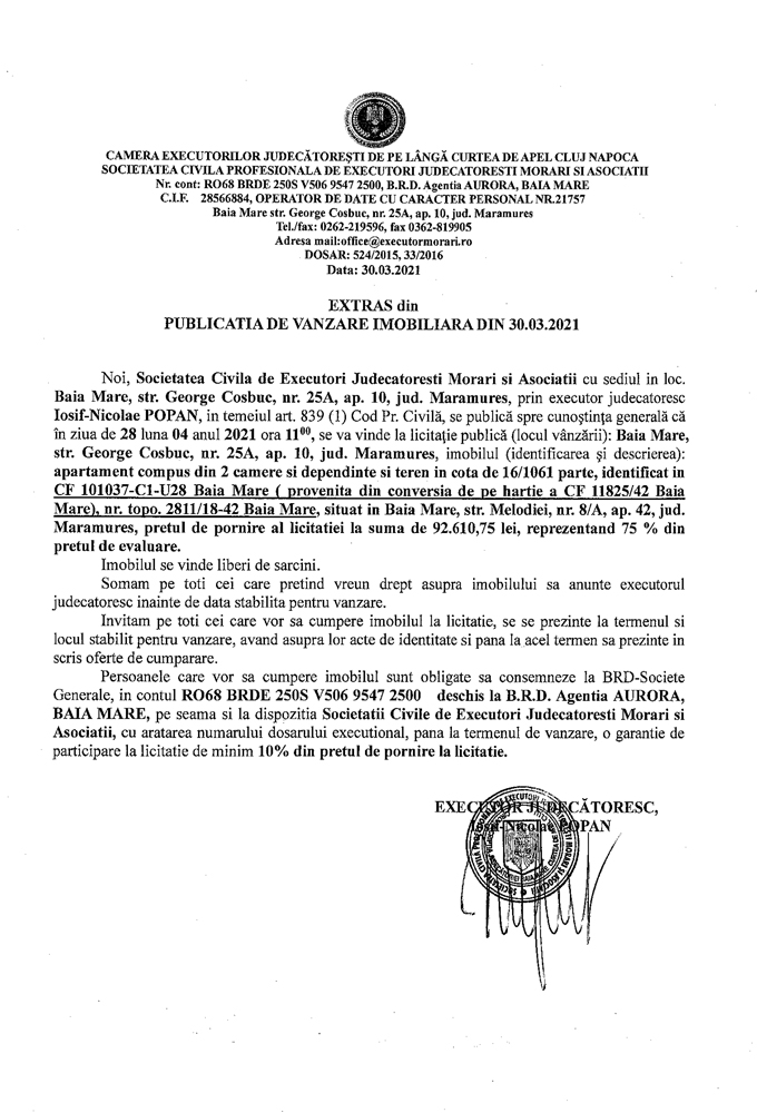 Noi, Societatea Civilă Profesională de Executori Judecătorești Morari și Asociații cu sediul în loc. Baia Mare, str. George Coșbuc, nr. 25A, ap. 10, jud. Maramureș, prin executor judecătoresc Iosif-Nicolae POPAN în temeiul art. 839 (1) Cod. Pr. Civilă, se publică spre cunoștința generală că în ziua de 28 luna 04 anul 2021 ora 11.00 se va vinde la licitație publică (locul vânzării): Baia Mare, str. George Coșbuc, nr. 25A, ap. 10, jud Maramureș din imobilul descris în documentul de mai jos: