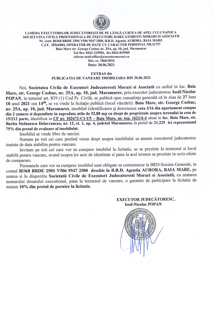 Noi, Societatea Civilă Profesională de Executori Judecătorești Morari și Asociații cu sediul în loc. Baia Mare, str. George Coșbuc, nr. 25A, ap. 10, jud. Maramureș, prin executor judecătoresc Iosif-Nicolae POPAN în temeiul art. 839 (1) Cod. Pr. Civilă, se publică spre cunoștința generală că în ziua de 27 luna 10 anul 2021 ora 14.00, se va vinde la licitație publică (locul vânzării): Baia Mare, str. George Coșbuc, nr. 25A, ap. 10, jud Maramureș imobilul descris în documentul de mai jos: