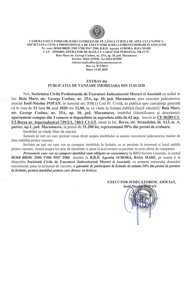 Noi, Societatea Civilă Profesională de Executori Judecătorești Morari și Asociații cu sediul în loc. Baia Mare, str. George Coșbuc, nr. 25A, ap. 10, jud. Maramureș, prin executor judecătoresc Iosif-Nicolae POPAN, în temeiul art. 838(1) Cod. Pr. Civilă, se publică spre cunoștința generală că în ziua de 12 luna 06 anul 2020 ora 12,00, se va vinde la licitație publică (locul vânzării): Baia Mare, str. George Coșbuc, nr. 25A, ap. 10, jud Maramureș din imobilul descris în documentul de mai jos:
