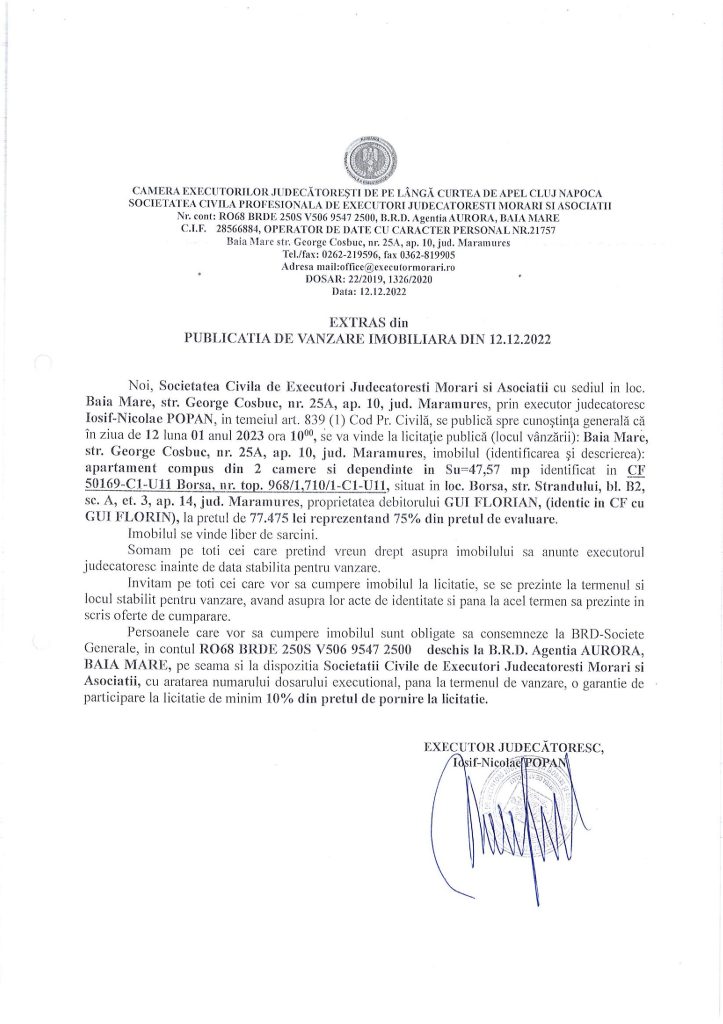 Vânzare apartament în Borșa – Extras publicație imobiliară, din data de 12. 12. 2022