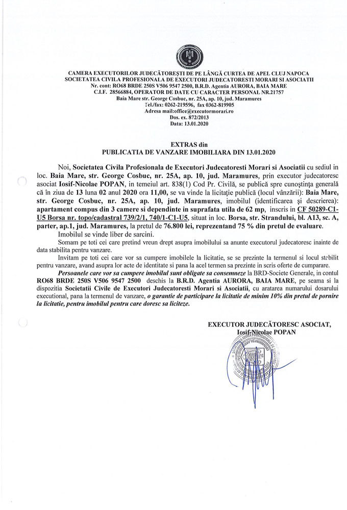 Noi, Societatea Civila Profesionala de Executori Judecatoresti Morari si Asociatii cu sediul in loc. Baia Mare, str. George Cosbuc, nr. 25A, ap. 10, jud. Maramures, prin executor judecatoresc Iosif-Nicolae POPAN, in temeiul art. 838(1) Cod. Pr. Civila, se publica spre cunostinta generala ca in ziua de 13 luna 02 anul 2020 ora 11,00, se va vinde la licitatie publica (locul vanzarii): Baia Mare, str. George Cosbuc, nr. 25A, ap. 10, jud Maramures, imobilul descris in documentul de mai jos: