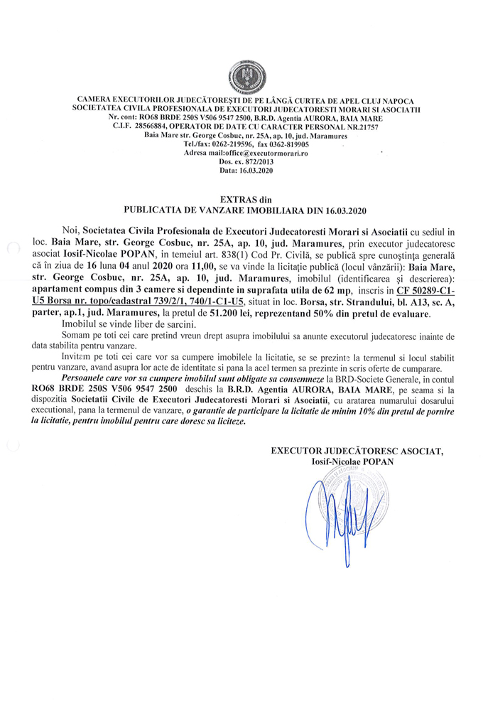 Noi, Societatea Civila Profesionala de Executori Judecatoresti Morari si Asociatii cu sediul in loc. Baia Mare, str. George Cosbuc, nr. 25A, ap. 10, jud. Maramures, prin executor judecatoresc Iosif-Nicolae POPAN, in temeiul art. 838(1) Cod. Pr. Civila, se publica spre cunostinta generala ca in ziua de 16 luna 04 anul 2020 ora 11,00, se va vinde la licitatie publica (locul vanzarii): Baia Mare, str. George Cosbuc, nr. 25A, ap. 10, jud Maramures din imobilul descris in documentul de mai jos: