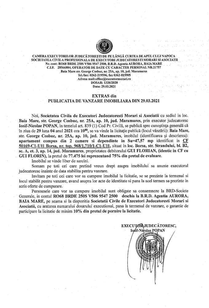Noi, Societatea Civilă Profesională de Executori Judecătorești Morari și Asociații cu sediul în loc. Baia Mare, str. George Coșbuc, nr. 25A, ap. 10, jud. Maramureș, prin executor judecătoresc Iosif-Nicolae POPAN în temeiul art. 839 (1) Cod. Pr. Civilă, se publică spre cunoștința generală că în ziua de 29 luna 04 anul 2021 ora 10.00 se va vinde la licitație publică (locul vânzării): Baia Mare, str. George Coșbuc, nr. 25A, ap. 10, jud Maramureș din imobilul descris în documentul de mai jos: