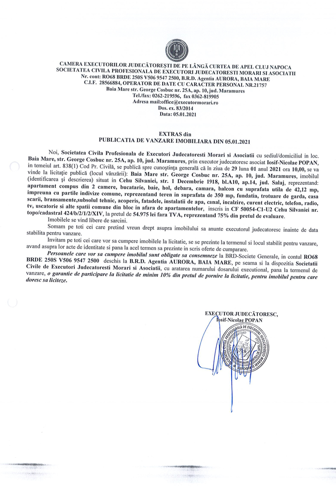 Noi, Societatea Civilă Profesională de Executori Judecătorești Morari și Asociații cu sediul/domiciliul în loc. Baia Mare, str. George Coșbuc, nr. 25A, ap. 10, jud. Maramureș, prin executor judecătoresc Iosif-Nicolae POPAN în temeiul art. 839 (1) Cod. Pr. Civilă, se publică spre cunoștința generală că în ziua de 29 luna 01 anul 2021 ora 10,00 se va vinde la licitație publică (locul vânzării): Baia Mare, str. George Coșbuc, nr. 25A, ap. 10, jud Maramureș din imobilul descris în documentul de mai jos: