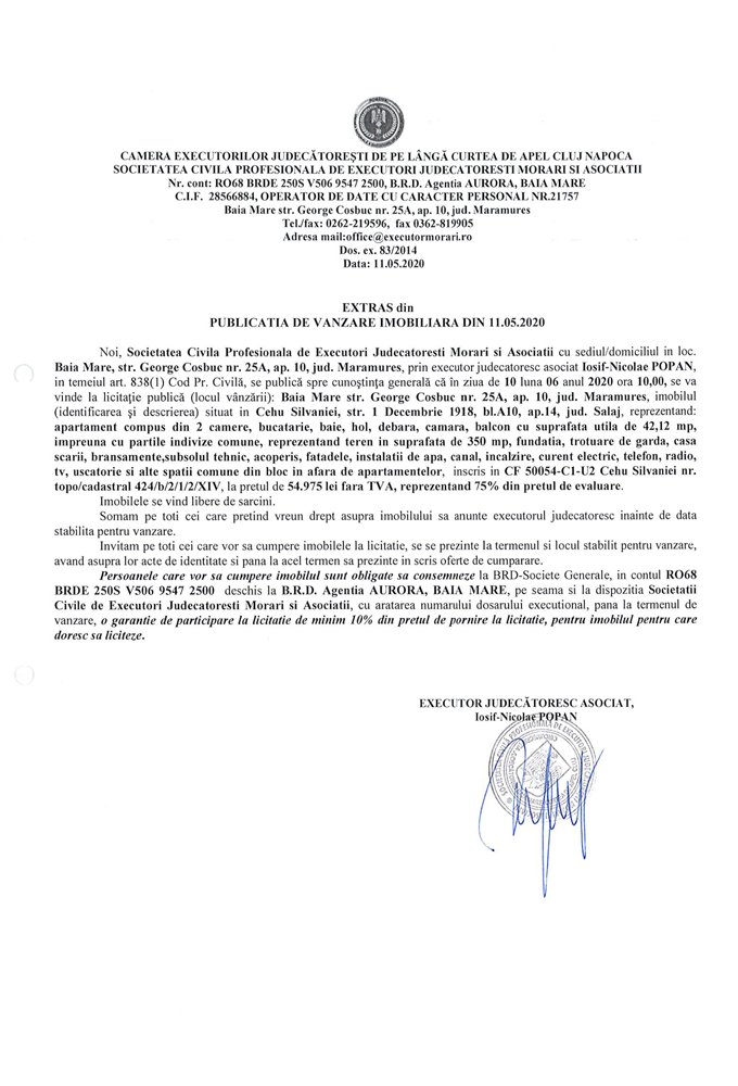 Noi, Societatea Civilă Profesională de Executori Judecătorești Morari și Asociații cu sediul/domiciliul în loc. Baia Mare, str. George Coșbuc, nr. 25A, ap. 10, jud. Maramureș, prin executor judecătoresc Iosif-Nicolae POPAN, în temeiul art. 838(1) Cod. Pr. Civilă, se publică spre cunoștința generală că în ziua de 10 luna 06 anul 2020 ora 10,00, se va vinde la licitație publică (locul vânzării): Baia Mare, str. George Coșbuc, nr. 25A, ap. 10, jud Maramureș din imobilul descris în documentul de mai jos: