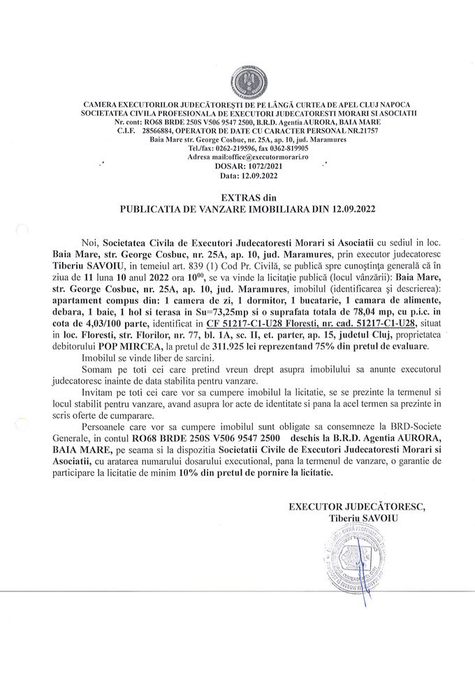 Noi, Societatea Civilă Profesională de Executori Judecătorești Morari și Asociații cu sediul în loc. Baia Mare, str. George Coșbuc, nr. 25A, ap. 10, jud. Maramureș, prin executor judecătoresc Iosif-Nicolae POPAN, în temeiul art. 839 (1) Cod. Pr. Civilă, se publică spre cunoștința generală că în ziua de 11 luna 10 anul 2022 ora 10.00, se va vinde la licitație publică (locul vânzării): Baia Mare, str. George Coșbuc, nr. 25A, ap. 10, jud Maramureș, imobilul descris în documentul de mai jos: