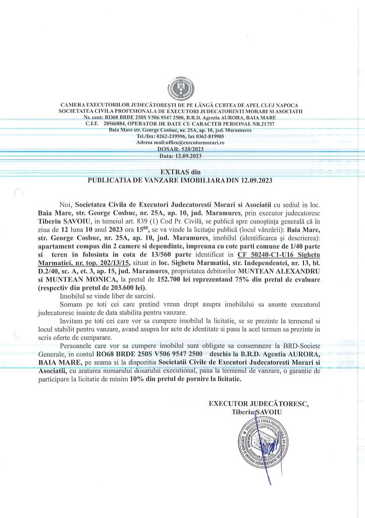 Vânzare apartament în Sighetu Marmației – Extras publicație imobiliară, din data de 12. 09. 2023