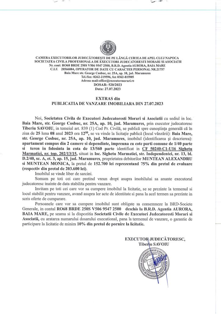 Vânzare apartament în Sighetu Marmației – Extras publicație imobiliară, din data de 27. 07. 2023