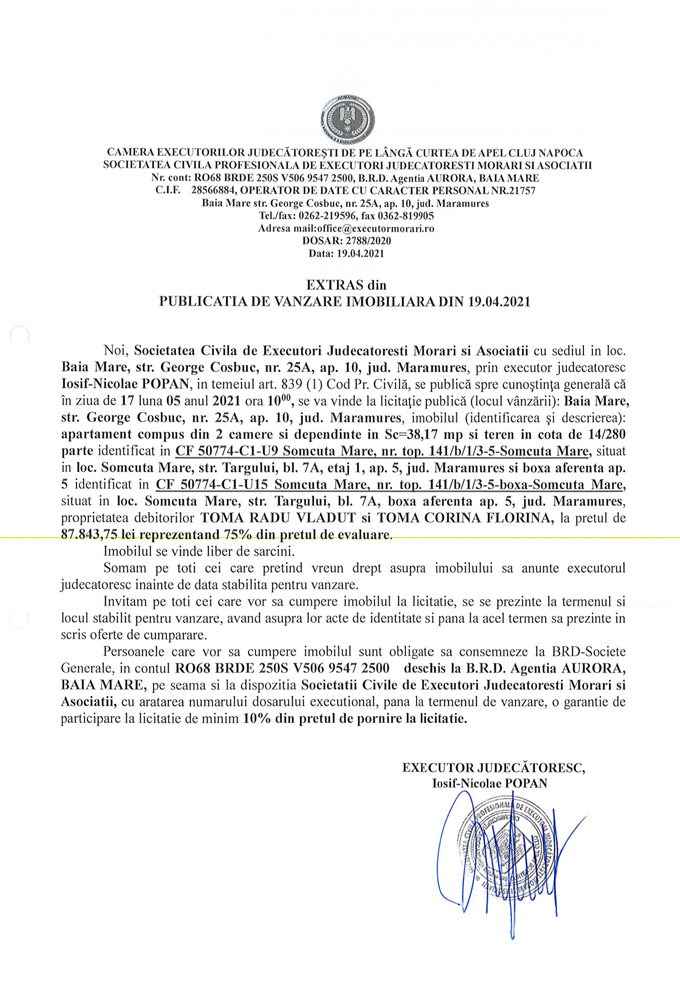Noi, Societatea Civilă Profesională de Executori Judecătorești Morari și Asociații cu sediul în loc. Baia Mare, str. George Coșbuc, nr. 25A, ap. 10, jud. Maramureș, prin executor judecătoresc Iosif-Nicolae POPAN în temeiul art. 839 (1) Cod. Pr. Civilă, se publică spre cunoștința generală că în ziua de 17 luna 05 anul 2021 ora 10.00 se va vinde la licitație publică (locul vânzării): Baia Mare, str. George Coșbuc, nr. 25A, ap. 10, jud Maramureș din imobilul descris în documentul de mai jos: