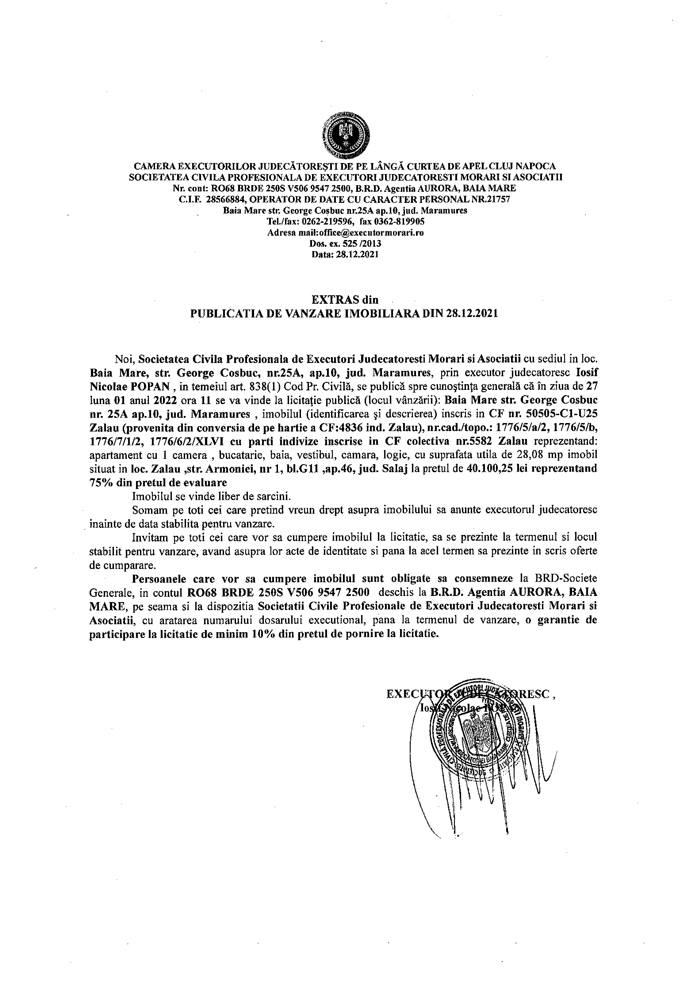 Noi, Societatea Civilă Profesională de Executori Judecătorești Morari și Asociații cu sediul în loc. Baia Mare, str. George Coșbuc, nr. 25A, ap. 10, jud. Maramureș, prin executor judecătoresc Iosif Nicolae POPAN în temeiul art. 838(1) Cod. Pr. Civilă, se publică spre cunoștința generală că în ziua de 27 luna 01 anul 2022 ora 11 se va vinde la licitație publică (locul vânzării): Baia Mare, str. George Coșbuc, nr. 25A, ap. 10, jud Maramureș, imobilul descris în documentul de mai jos: