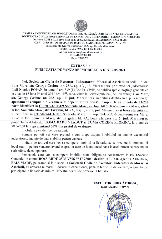 Noi, Societatea Civilă Profesională de Executori Judecătorești Morari și Asociații cu sediul în loc. Baia Mare, str. George Coșbuc, nr. 25A, ap. 10, jud. Maramureș, prin executor judecătoresc Iosif-Nicolae POPAN în temeiul art. 839 (1) Cod. Pr. Civilă, se publică spre cunoștința generală că în ziua de 18 luna 06 anul 2021 ora 10.00 se va vinde la licitație publică (locul vânzării): Baia Mare, str. George Coșbuc, nr. 25A, ap. 10, jud Maramureș imobilul descris în documentul de mai jos: