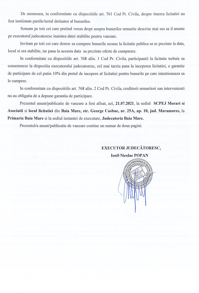 Noi, SOCIETATEA CIVILA PROFESIONALĂ DE EXECUTORI JUDECATOREȘTI MORARI ȘI ASOCIAȚII, cu sediul în loc. Baia Mare, str. George Cosbuc, nr. 25A, ap. 10, jud. Maramures, prin executor judecatoresc Iosif-Nicolae POPAN,